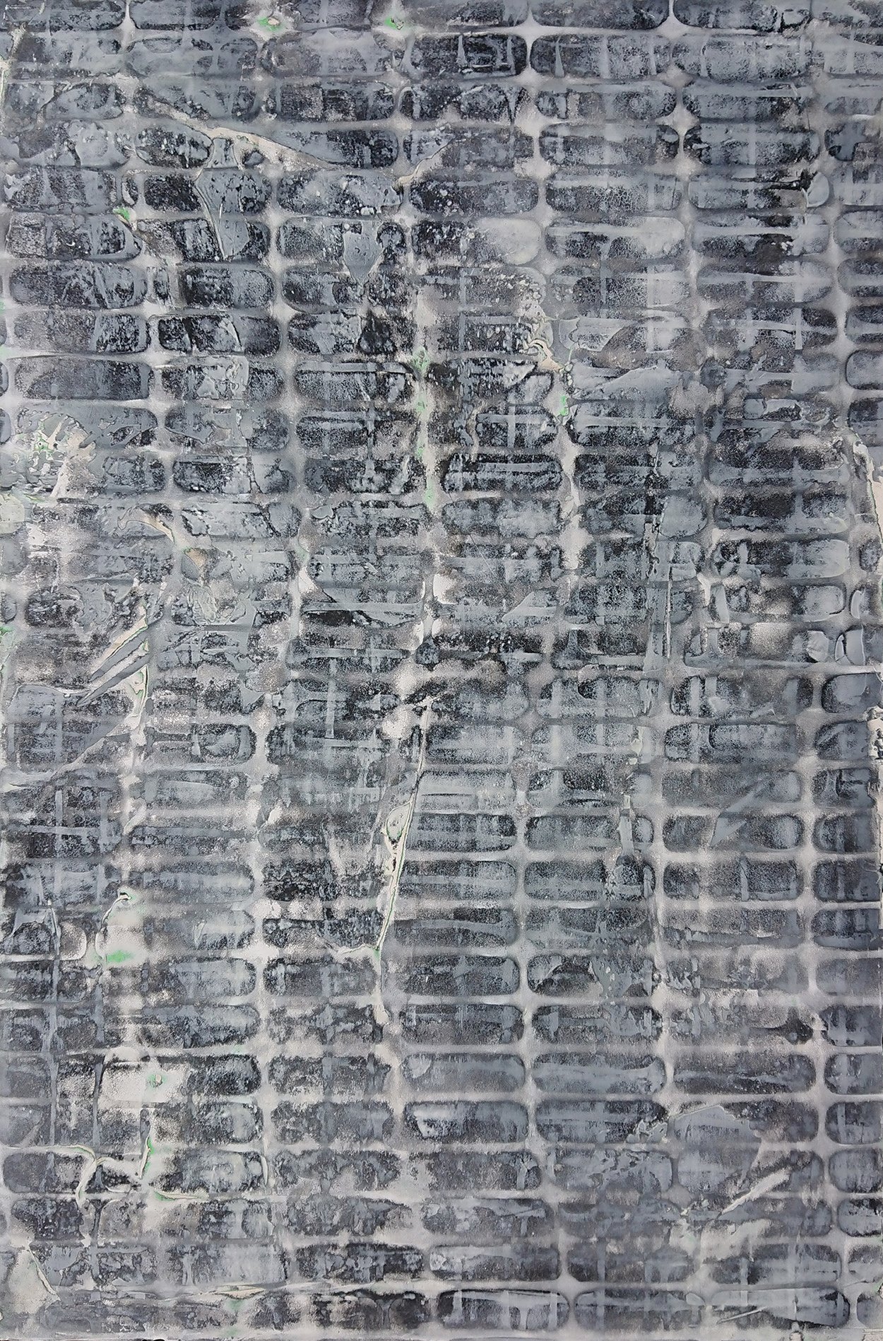 In the Hindsight Series, I have opened up the grid by spray painting through a stencil with punched holes. By manipulating the stencil and by repeating the process, the illusion of depth is created. Although the same process was used in creating each work, the end results are all different.